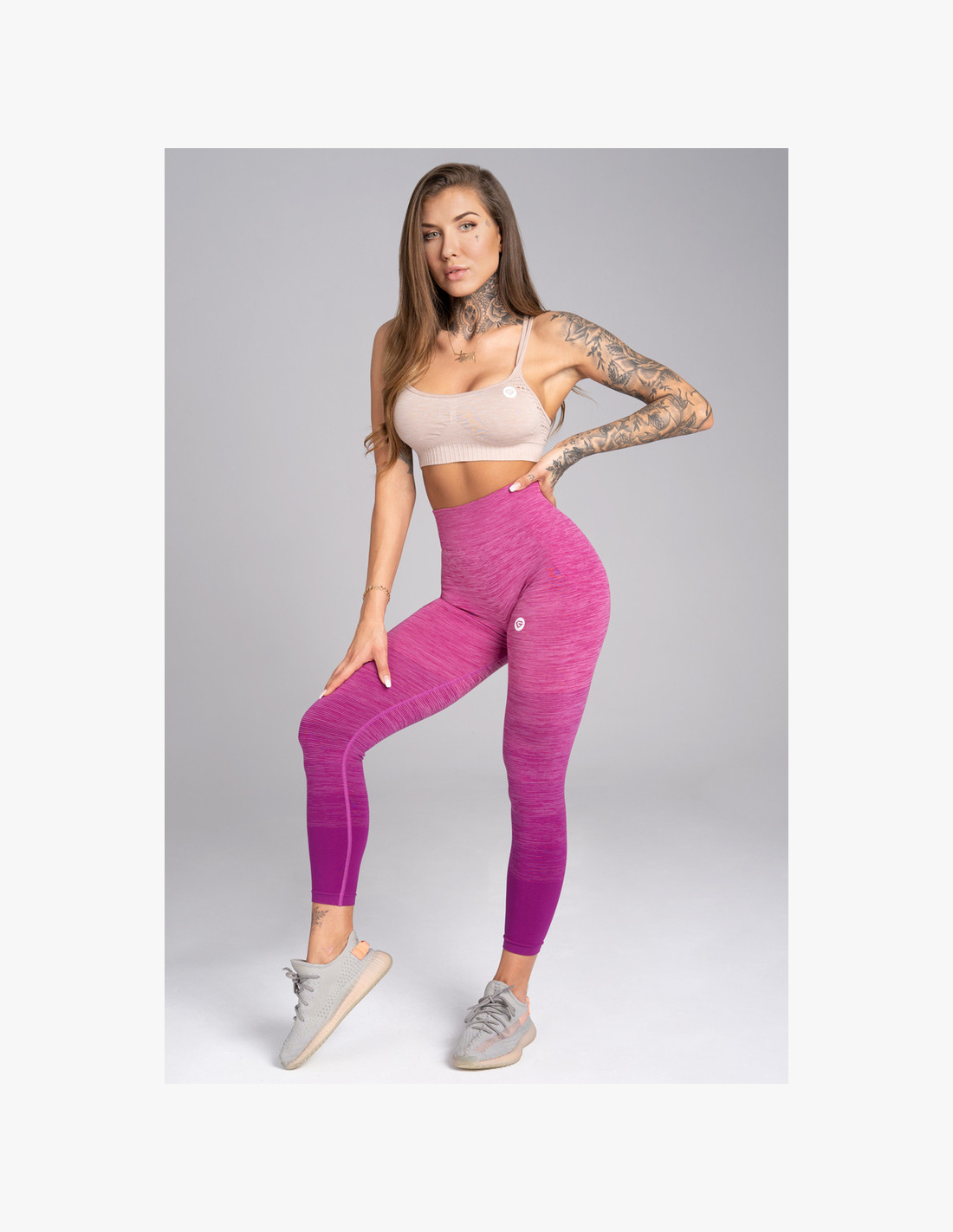 The brand Gym Glamour brings popular seamless leggings with a high waist in ombre style. The quality material is complemented by an elegant pink gradient that enhances your figure during every workout. The leggings are made from a combination of three types of fibers – as a result, the fabric is soft, elastic, and pleasant to the touch. Moreover, they are opaque, so you can focus solely on your performance. Compared to previous models, these leggings have a tapered crotch area for a more aesthetic appearance. However, due to their high elasticity, they easily adapt to any body shape.