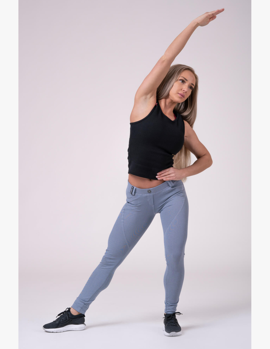 • denim-style leggings complemented with a faux fastening with a metal button