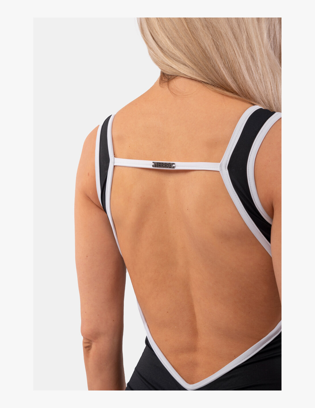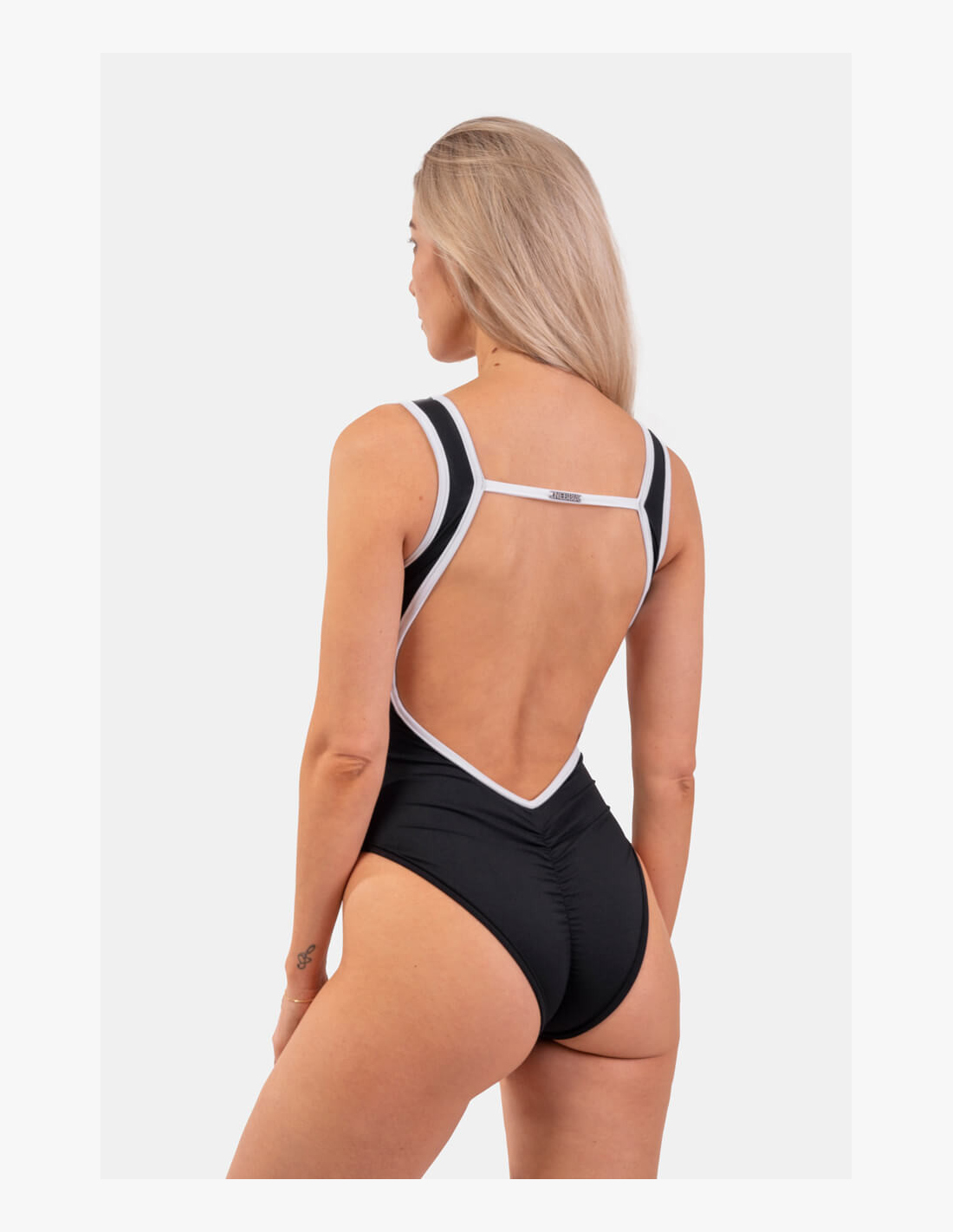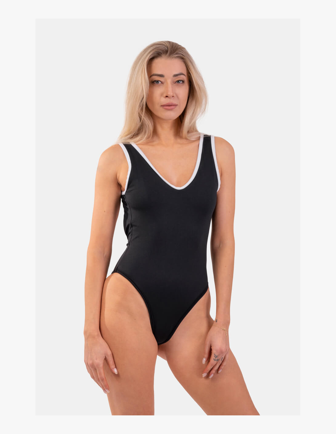 These full French style swimwear in beautiful black and white design will show you how irresistible you can be at every moment. The swimwear is trimmed with a white elastic band that adds a minimalist touch. It reveals nearly the entire back in the back and covers the whole bust in the front. The back area features a Scrunch-butt effect that enhances your curves.