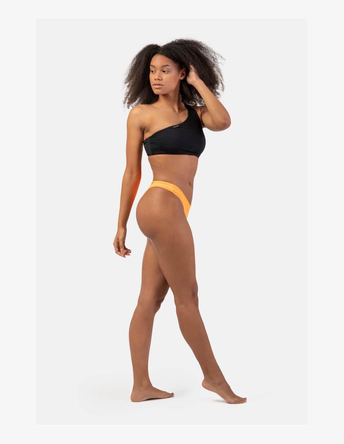 The one shoulder bandeau top will capture your admiration with its beautiful and timeless design. The front is designed as a single strap that splits into 5 thin straps at the back, creating a beautiful detail on the back. The top provides complete coverage of the bust, and the material it is made from is perfectly stretchy and firm, ensuring the swimsuit stays in place even during sports activities in the pool. The swimsuit is not see-through and has no underwire.