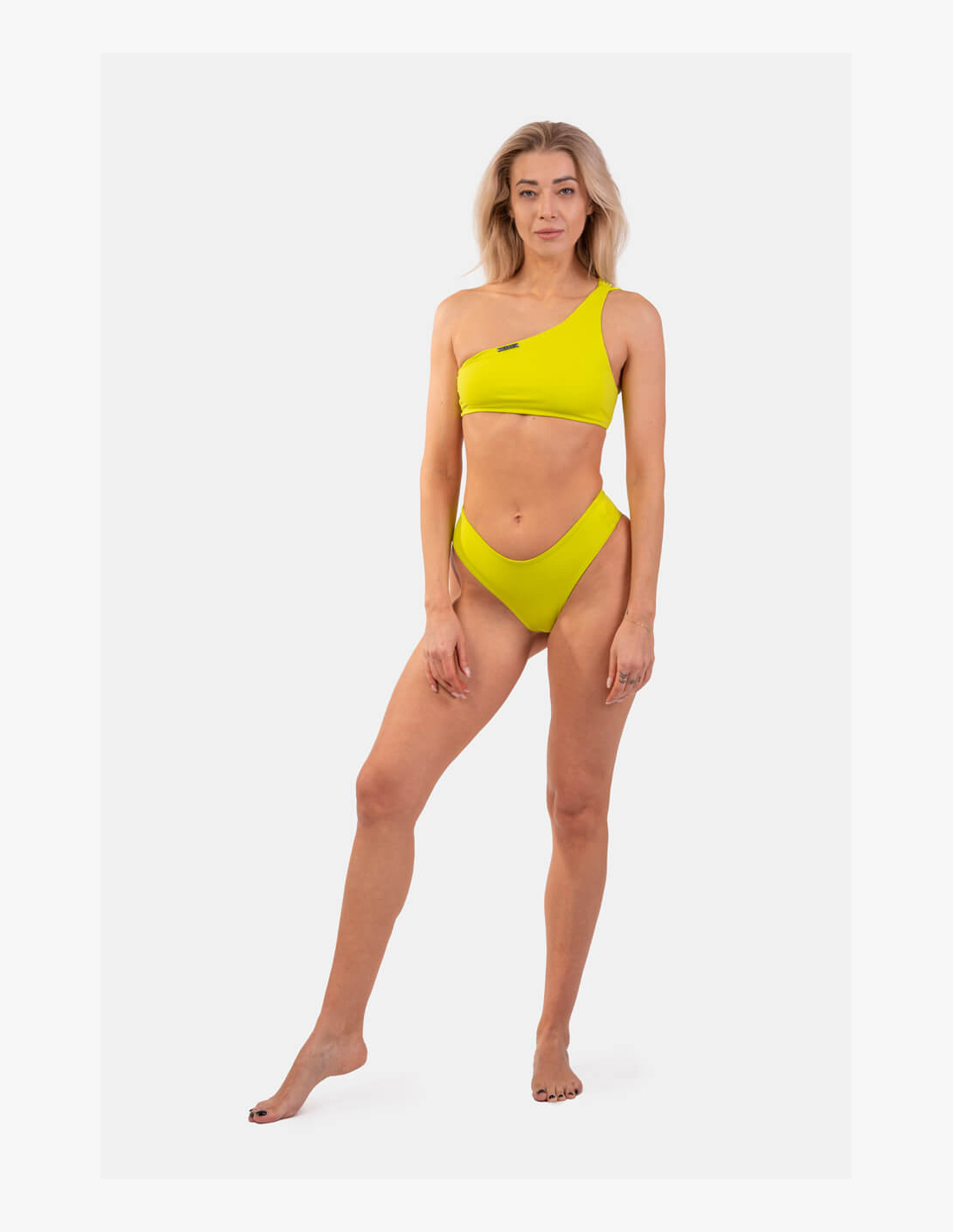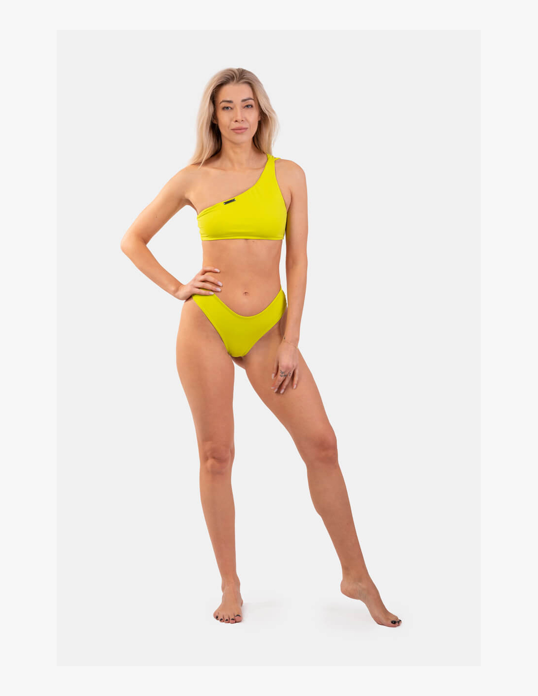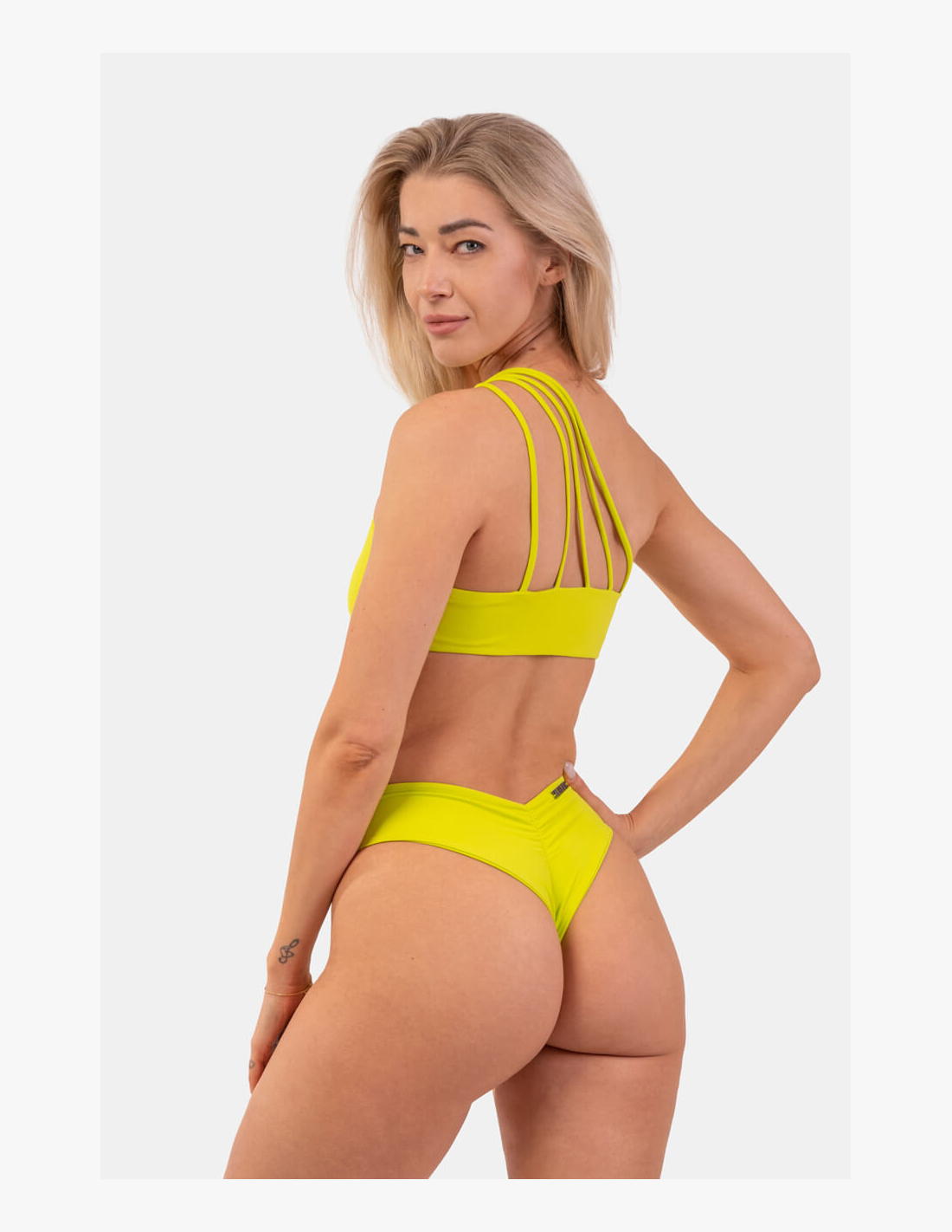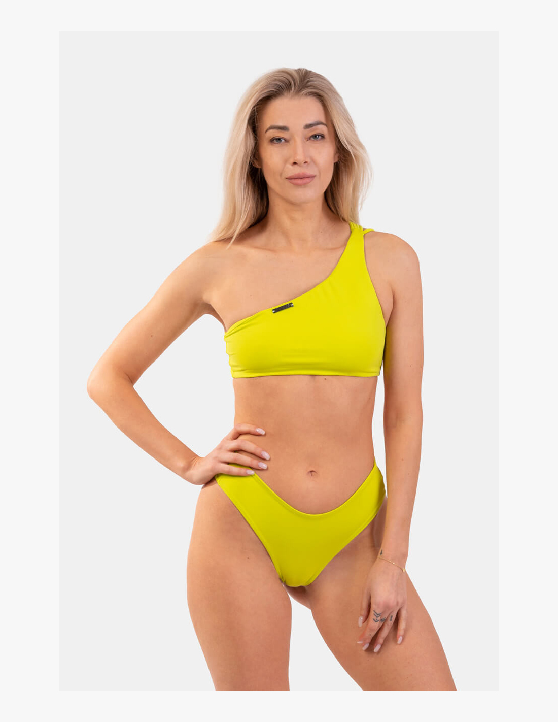 The one-shoulder bandeau top will gain your admiration thanks to its beautiful and timeless design. The front is designed with a single strap that splits into 5 thin straps at the back, creating a lovely detail on the back. The top provides complete coverage of the bust, and the material it is made from is perfectly stretchy and firm, ensuring the swimsuit stays in place even during sports activities in the pool. The swimsuit is not see-through and has no underwire.