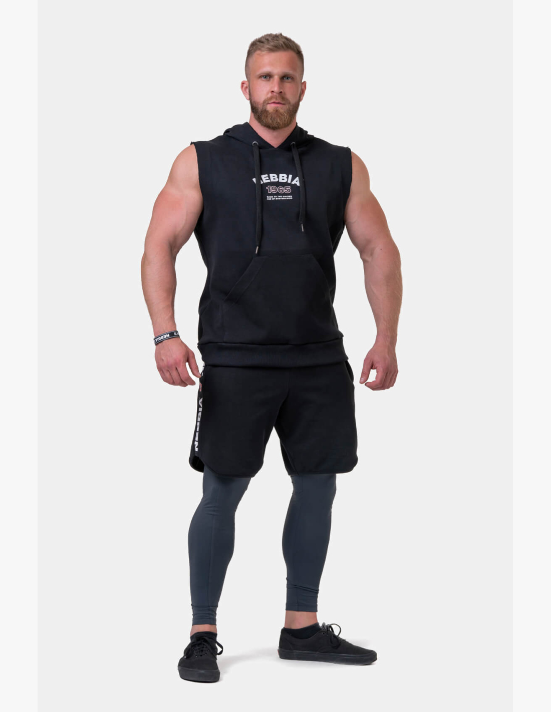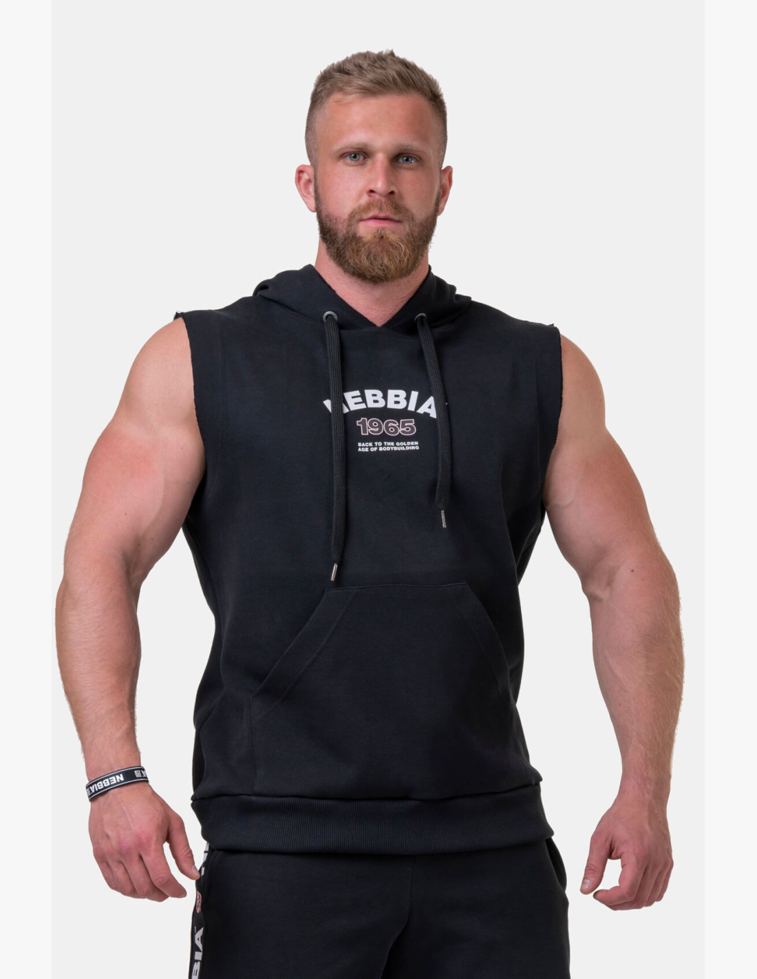 Recall and motivate yourself with the golden era of classic bodybuilding with the new 1965 collection. Enrich your training wardrobe with the new NEBBIA Golden Era ragtop, designed in a retro style and inspired by the greatest legends of men's bodybuilding, Mr. Olympia. The cut of the ragtop is designed to highlight your muscles. The sleeves are exactly shoulder-length in an unfinished design, creating an original look. The double-layered hood comes with internal drawstrings for tightening. A practical pocket on the front is appreciated by everyone. The bottom of the ragtop is finished with a patent. The material is a novelty: Portuguese cotton containing a small amount of elastane. This enhances the perfect properties of this material, which has an increased ability to wick sweat and moisture and wrinkles less. The chest features the NEBBIA 1965 logo, and there's a smaller Mr. Olympia logo on the back.