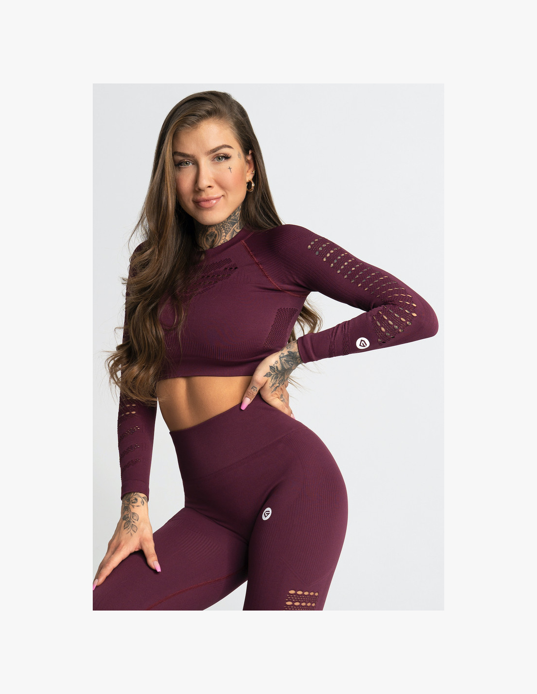 The long sleeve crop top is designed to combine style and functionality. It features a decorative detail of small perforations on the neckline, sleeves, back, and sides, giving the model a unique look while ensuring breathability. The top is unpadded, allowing for maximum freedom of movement and comfort when worn.