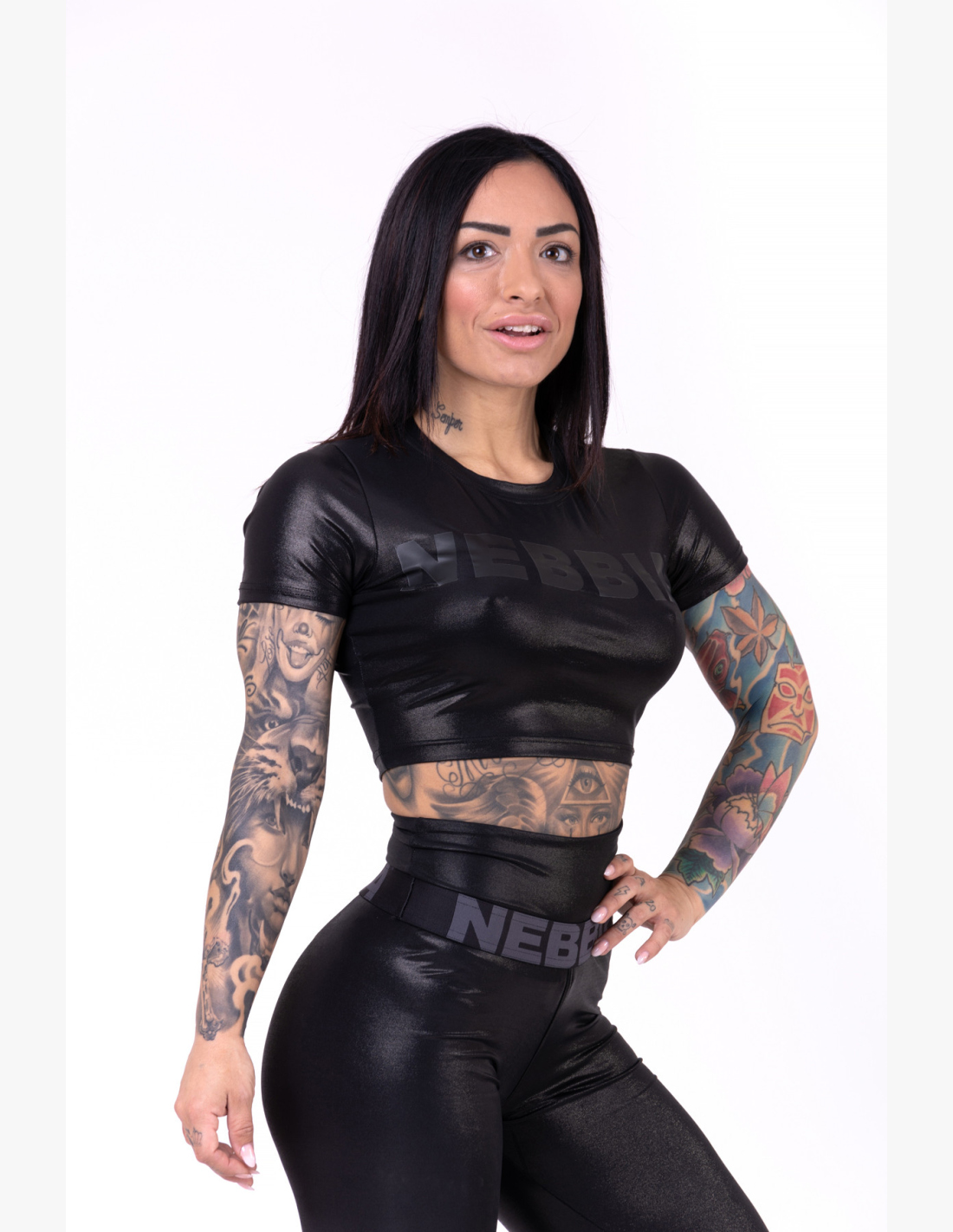 The minimalist design and inconspicuous tone-on-tone print on the front are balanced by the shiny look of the material, which feels very soft and adaptable to the touch. You will be surprised at how incredibly comfortable it is to wear! The crop cut emphasizes your figure, and it's up to you whether to show off your abs that you've been working on during workouts or to pair the shirt with sexy high-waisted leggings.
