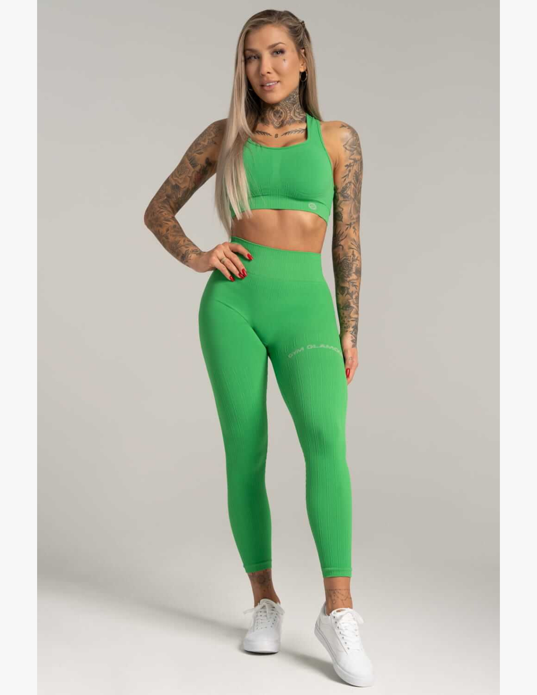 Le legging Gym Glamour senza cuciture push up sono la nostra novità. I leggings sono migliorati con una speciale imbottitura sul sedere. Il materiale super elastico è stato riprogettato sul sedere per sollevarlo. Un grande vantaggio è che sono opachi, il che significa che puoi indossarli non solo per allenarti, ma anche per l'uso quotidiano. La fascia modellante alta è contenitiva, ma flessibile. Modella magnificamente la figura. Essendo alta, nasconde anche la pancia problematica. Anche sotto maggiore sforzo, non devi preoccuparti, poiché il materiale è di un tessuto che non mostra il sudore.