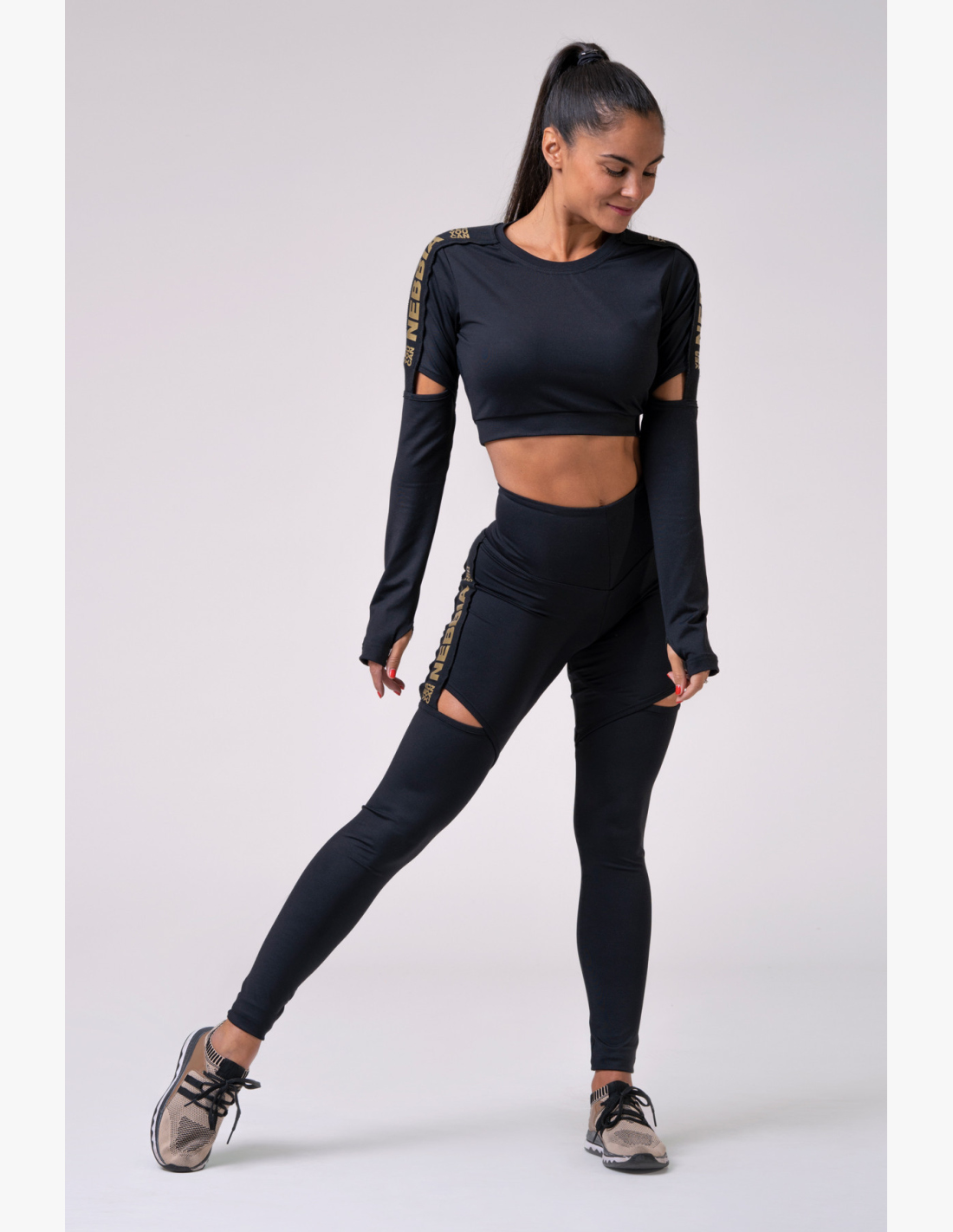 Materiale compressivo resistente, tagli elaborati sulle cosce, taglio a vita alta, effetto di evidenziazione del fondoschiena, gomma sottile in vita garantisce stabilità, iconiche lampade dorate in colore oro.
