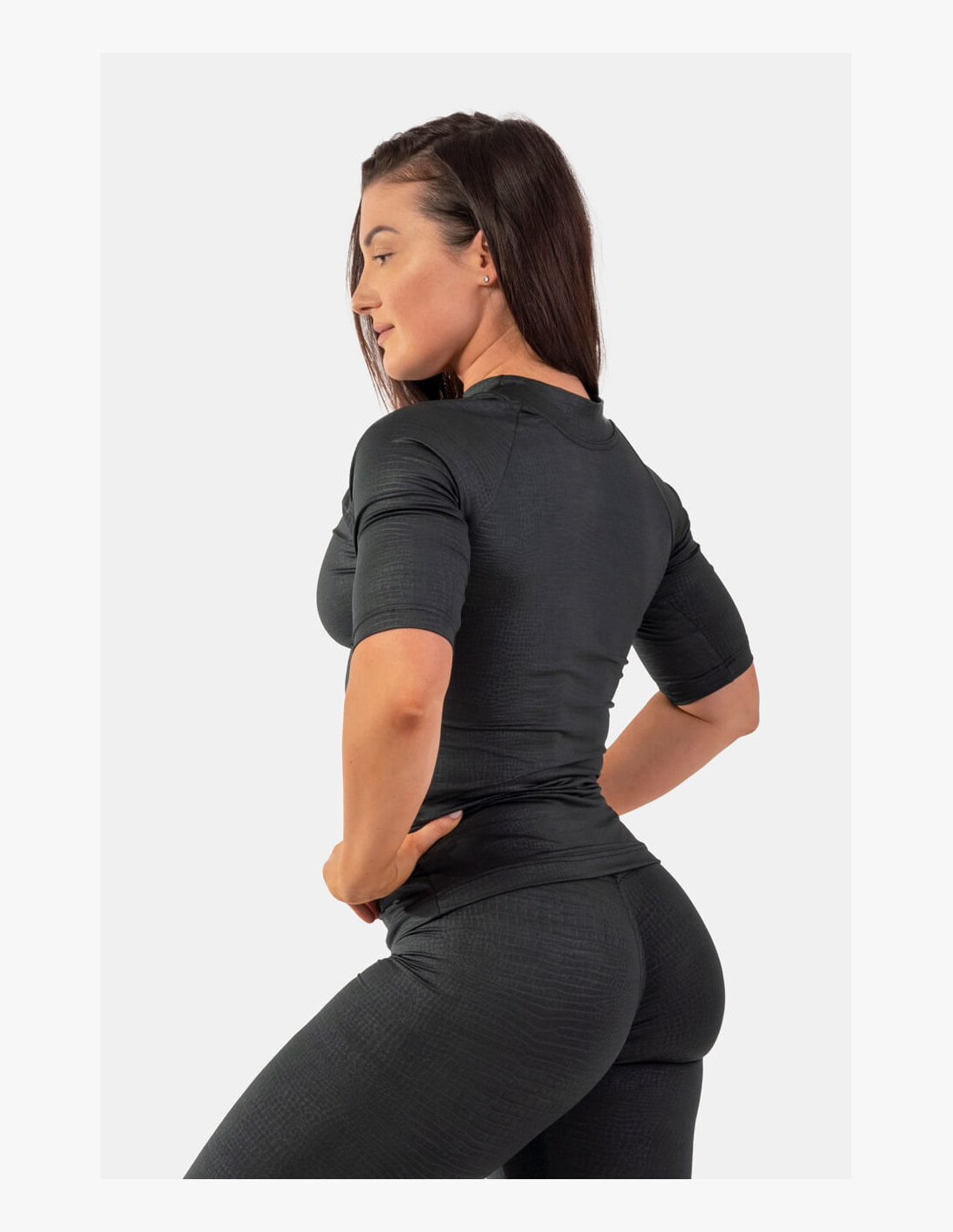 Questa maglietta da donna in materiale pelle di serpente sarà quella che vorrai indossare ogni giorno, grazie al tessuto elastico, altamente funzionale e traspirante. Il taglio slim-fit e il collo alto daranno vita al tuo outfit sia in palestra che in città.