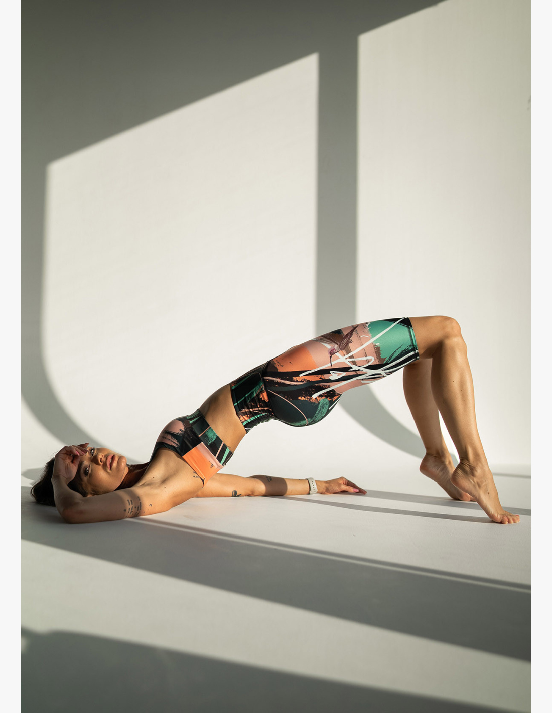 Šortky Terra ti oživia šatník vďaka hravosti pastelových farieb, prevažne zelenej a vzoru v podobe asymetrických vzorov. Majú pevné prešitie švov, ktoré ti zabezpečí krásne tvary postavy a pevnosť materiálu aj pri veľkej fyzickej námahe. Jedinečný dizajnový vzor. Made in Slovakia. Môžeš si ich skombinovať s podprsenkou rovnakej farby. Modelka meria 161 cm a nosí veľkosť S.