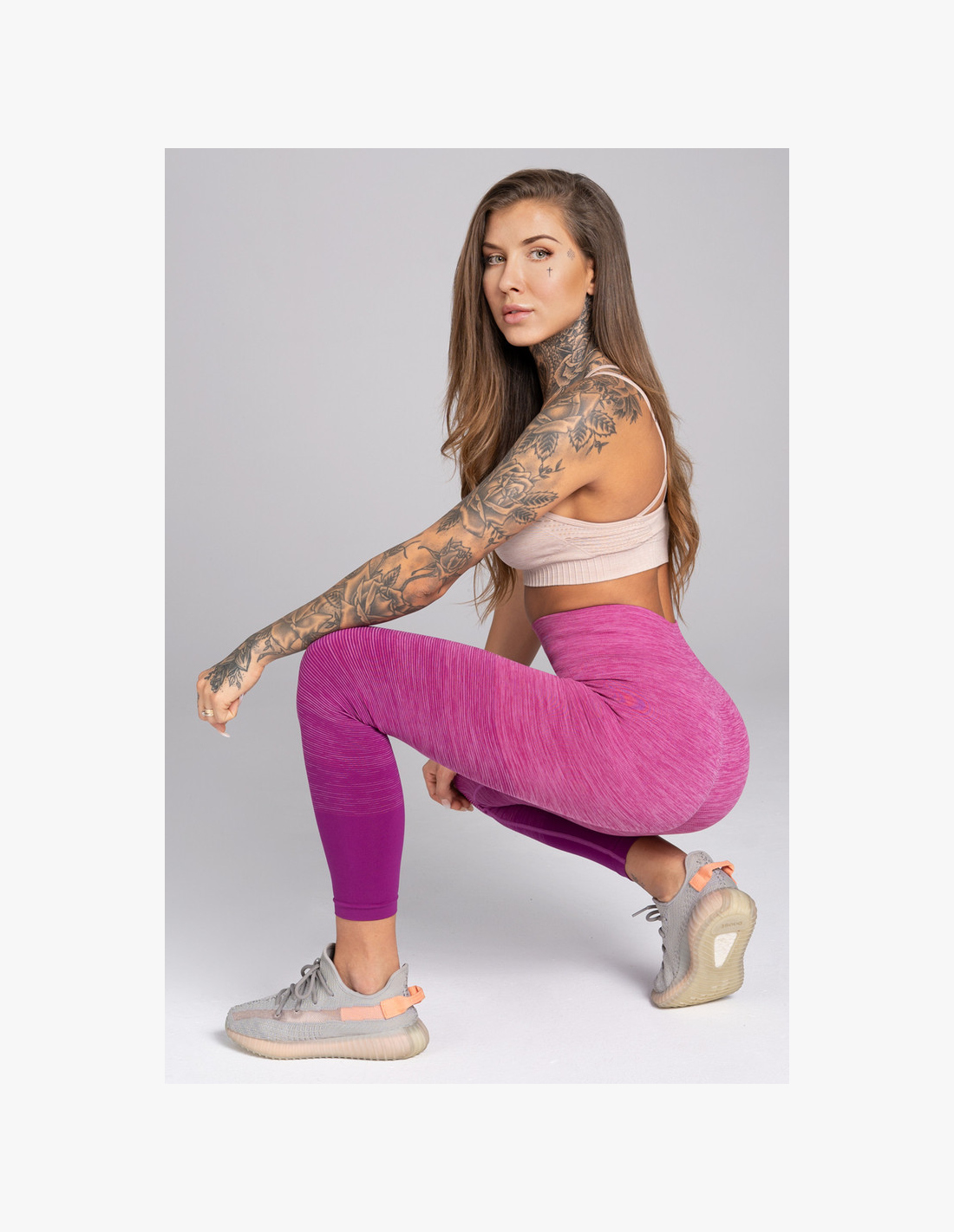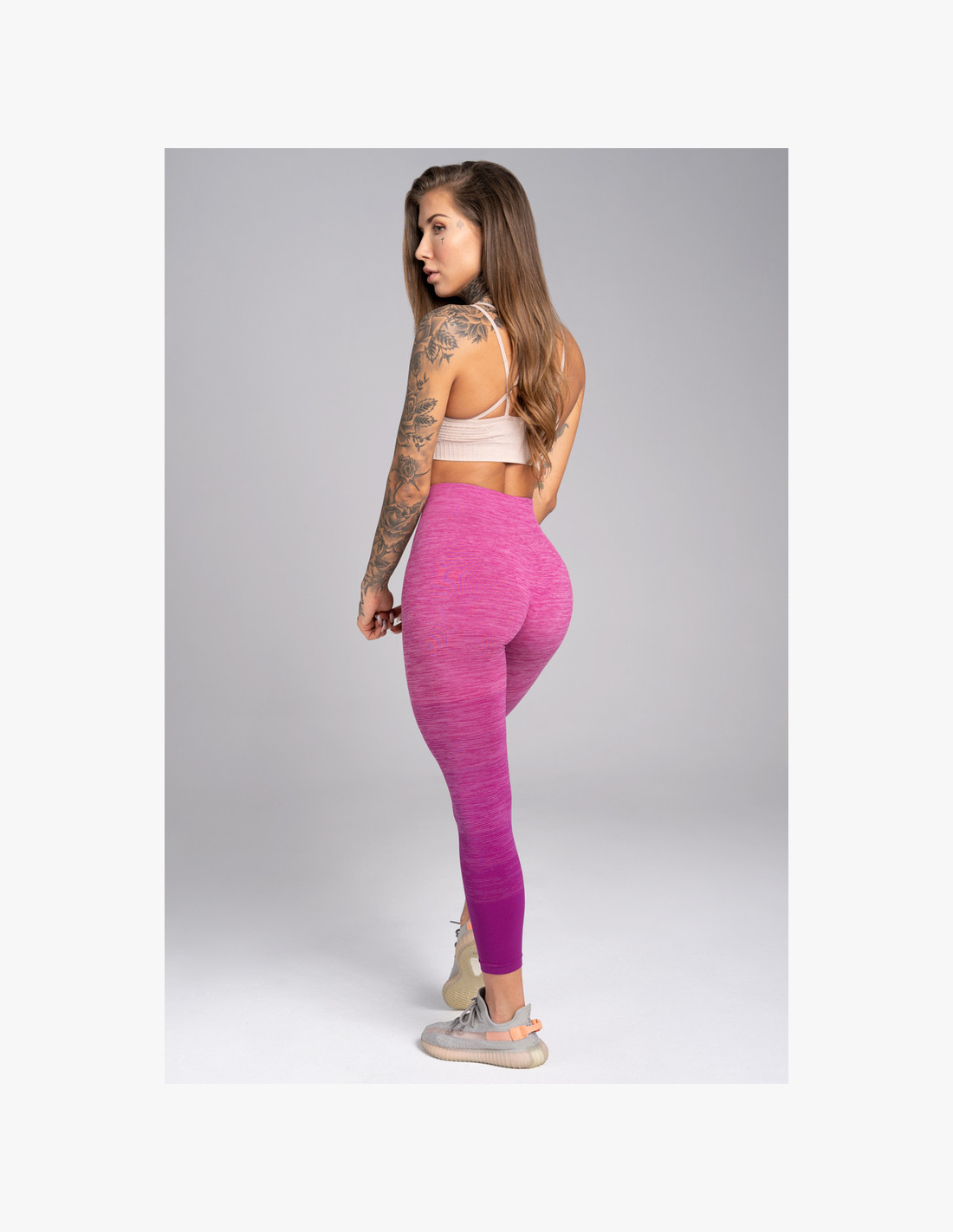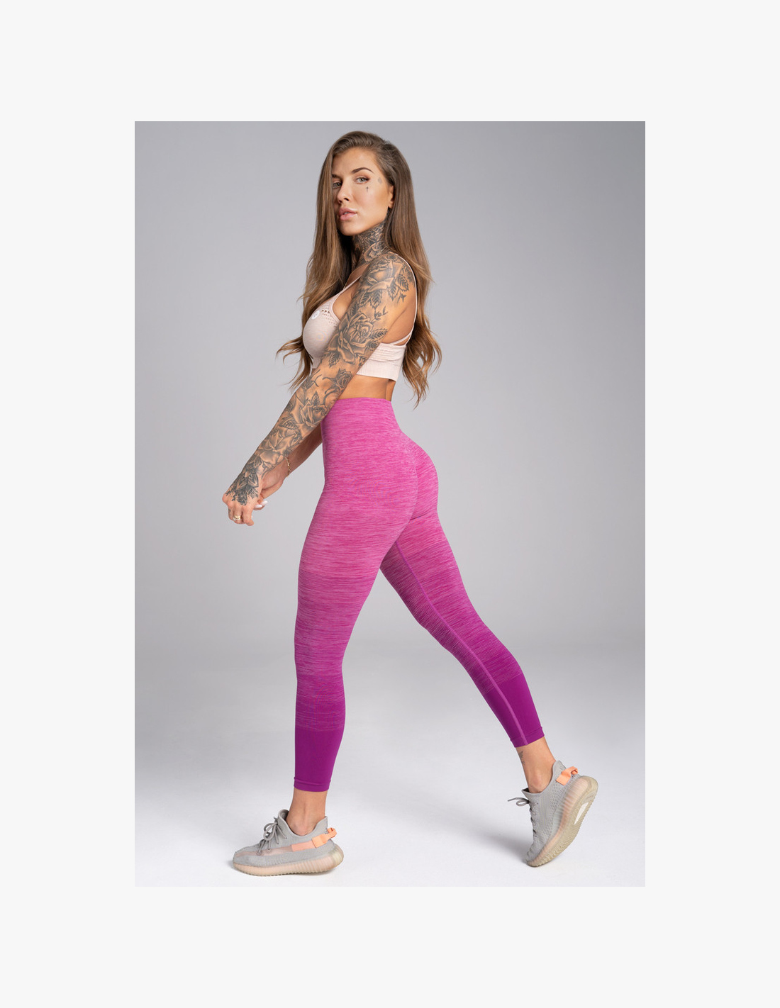 Značka Gym Glamour prináša obľúbené bezešvé legíny s vysokým pasom v ombré štýle. Kvalitne spracovaný materiál dopĺňa elegantný ružový prechod, ktorý zvýrazní vašu postavu pri každom tréningu. Legíny sú vyrobené z kombinácie troch typov vlákien – vďaka tomu je látka jemná, pružná a príjemná na dotyk. Navyše nepresvitá, takže sa môžete sústrediť len na výkon. Oproti predchádzajúcim modelom majú tieto legíny zúženú oblasť rozkroku pre estetickejší vzhľad. Vďaka vysokej elasticite sa však ľahko prispôsobia každej postave.