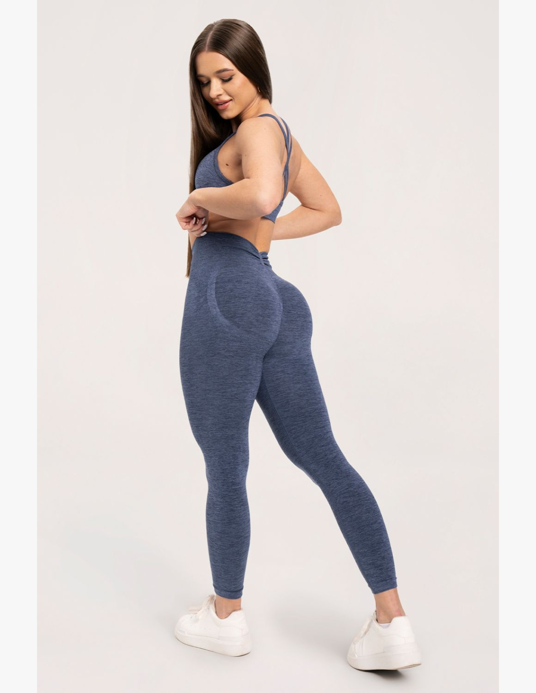 Tieto legíny využívajú špeciálnu konštrukciu s predĺženým klinom až po pás, ktorý vytvára intenzívny push-up efekt a krásne zvýrazní vaše krivky. Zadná časť je navrhnutá do efektného "V" tvaru, ktorý opticky zužuje siluetu a zdôrazňuje zadoček. Materiál je maximálne pohodlný – ide o jemnú, elastickú a priedušnú látku. Legíny nepresvitajú, skvele sedia a vďaka svojej tenkosti a pružnosti pôsobia ako druhá koža. Na tele ich takmer neucítite. Perfektne kopírujú postavu, a preto sa hodia nielen na šport, ale aj na bežné nosenie. Pás je elastický, ale zároveň poskytuje miernu kompresiu – krásne drží, nepovolí a opticky zmenšuje oblasť pásu. Vďaka melírovanej úprave látky nie sú vidieť stopy potu ani pri náročnom tréningu.