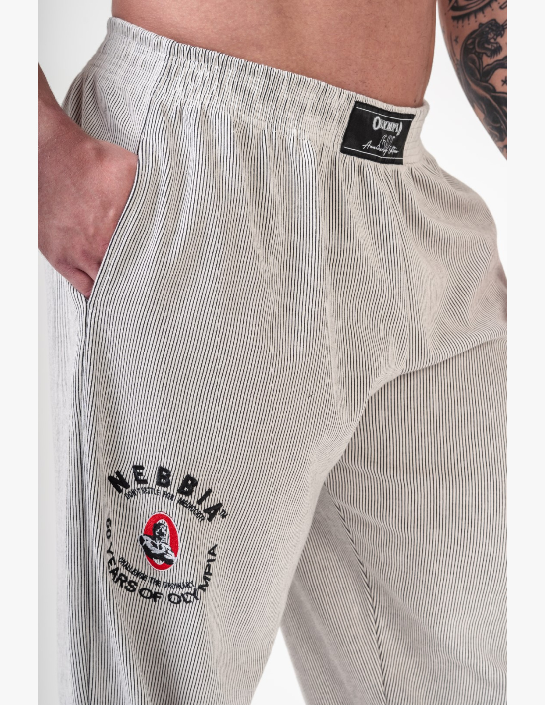 Ležérny strih, elastický pás a pruhovaný pinstripe vzor – kombinácia, ktorá ťa nezastaví ani pri tréningu, ani pri chillovaní. Každý detail ladí s duchom amerických gymov, kde vznikali legendy. Logo NEBBIA a prvky Mr. Olympia pripomínajú, že táto éra nekončí – pokračuje s tebou.