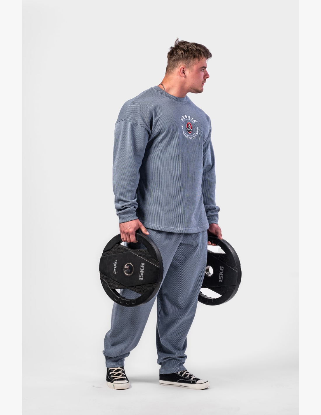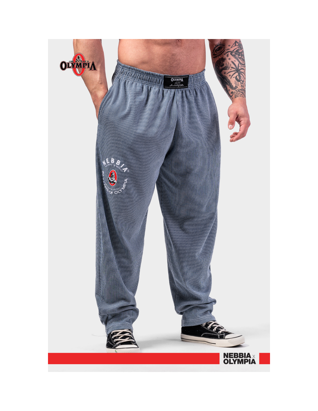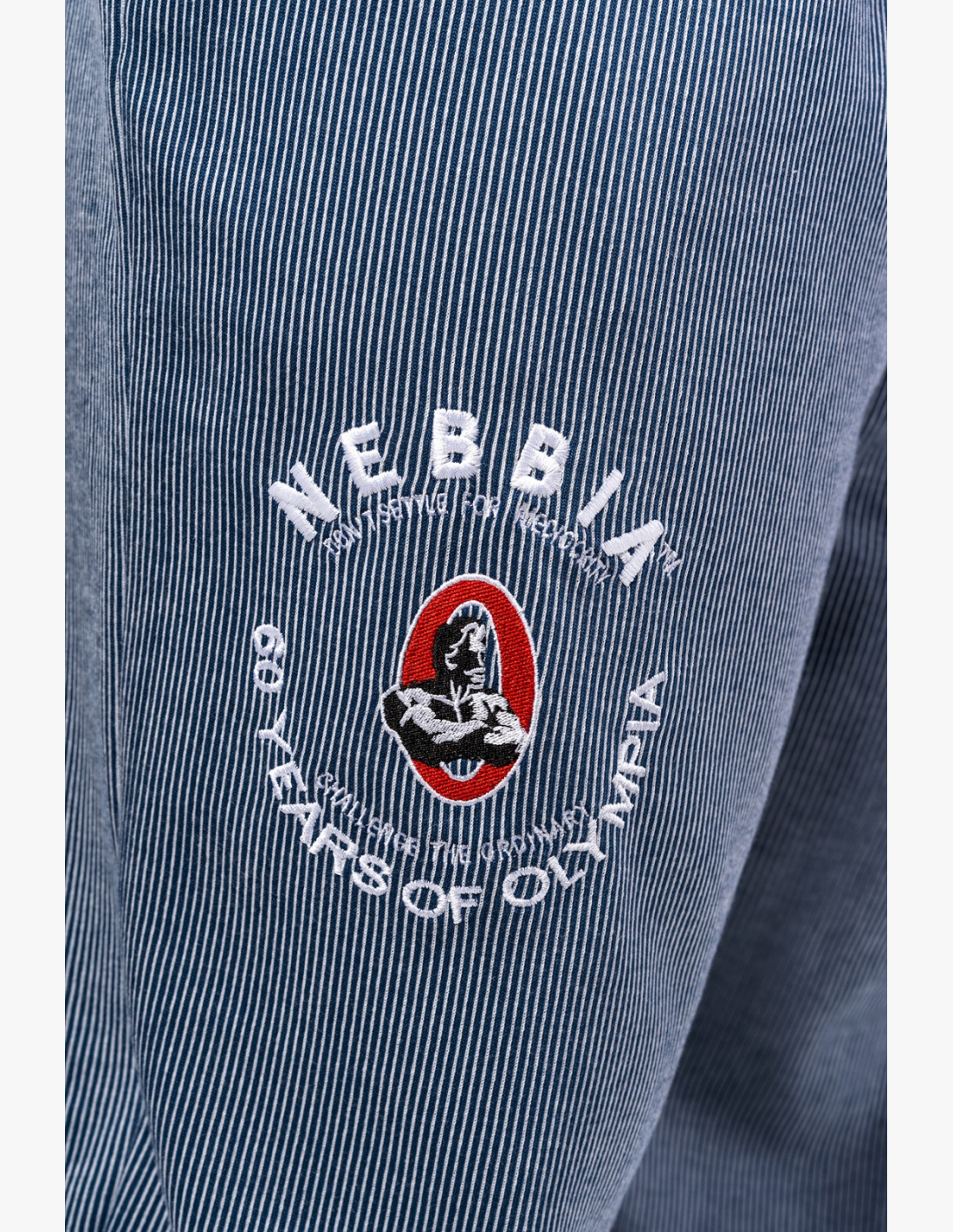 Ležérny strih, elastický pás a pruhovaný pinstripe vzor – kombinácia, ktorá ťa nezastaví ani pri tréningu, ani pri chillovaní. Každý detail ladí s duchom amerických gymov, kde vznikali legendy. Logo NEBBIA a prvky Mr. Olympia pripomínajú, že táto éra nekončí – pokračuje s tebou.