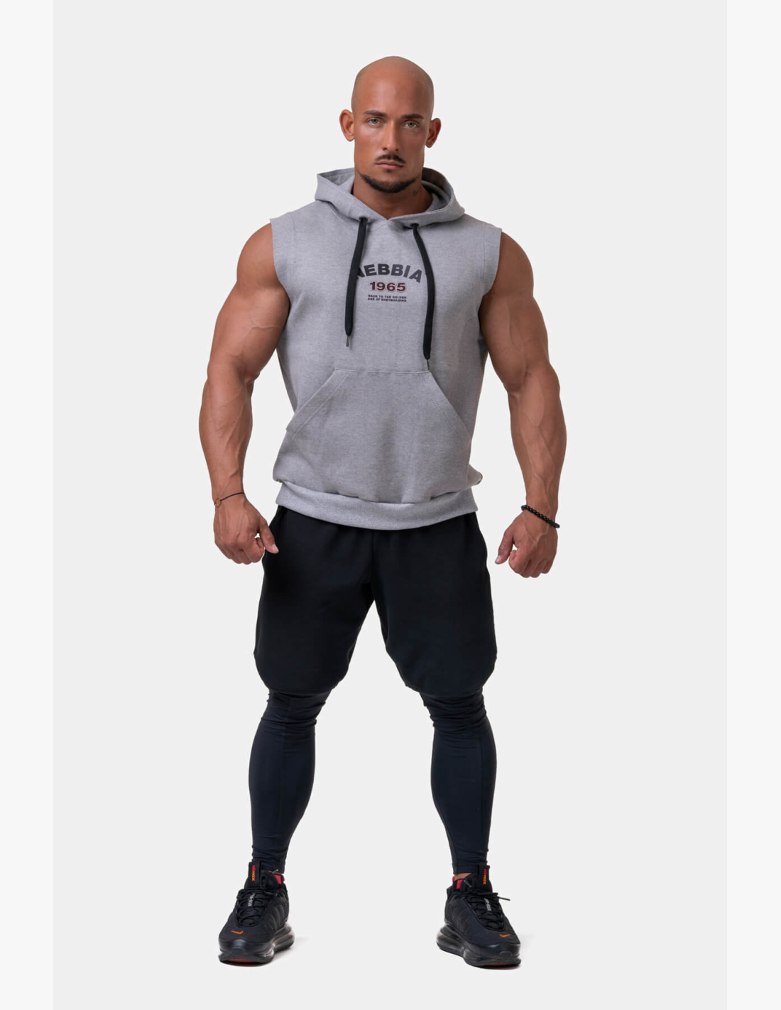 Pripomeň si a motivuj sa zlatou érou klasickej kulturistiky s novou kolekciou 1965. Obohať svoj tréningový šatník o nový NEBBIA Golden Era rag top, ktorý je navrhnutý v retro štýle a inšpirovaný tými najväčšími legendami mužskej kulturistiky Mr.Olympia. Strih rag topu je navrhnutý presne tak, aby boli tvoje svaly zvýraznené. Rukávy sú presne po ramená v neukončenom dizajne, čo pôsobí originálne. Dvouvrstvová kapucňa je doplnená vnútornými šnúrkami na stiahnutie. Praktickú kapsu vpredu ocení každý. Spodná časť rag topu je lemovaná patentom. Materiál je novinka. Portugalská bavlna obsahujúca malé množstvo elastanu. Zvyšuje perfektné vlastnosti tohto materiálu, ktorý má zvýšenú schopnosť odvádzať pot a vlhkosť a menej sa krčí. Hruď zdobí logo NEBBIA 1965 a na chrbte je menšie logo Mr.Olympia.