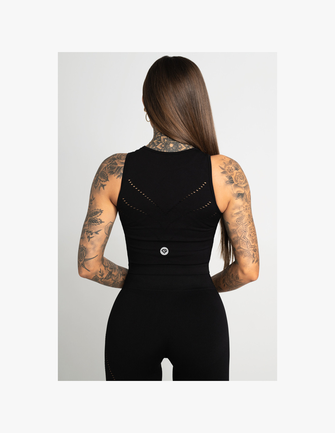 Ženský športový top s premysleným strihom a nápaditými detailami. Ramienka sú navrhnuté tak, aby opticky rozšírili ramená, zatiaľ čo odhalené chrbát podčiarkuje ženský vzhľad.